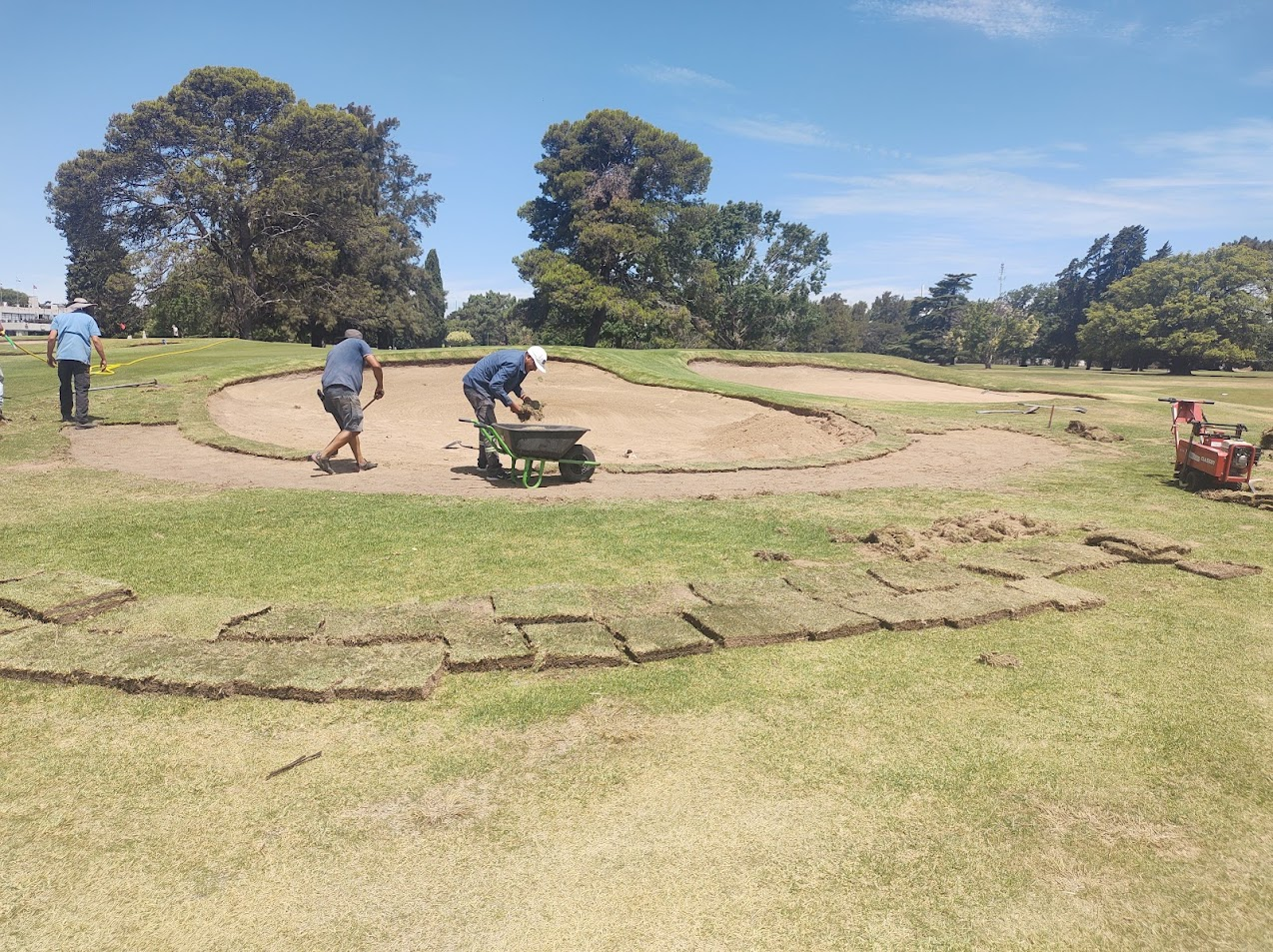 Frente a esta situación, algunos clubes optan por volver los bordes a su nivel original. Tal es el caso del San Isidro GC (Argentina) (foto), que ha empezado el proceso a través de la extracción de los panes de césped de los bordes del bunker, el retiro del material arenoso sobrante, y la recolocación de los panes extraídos. A través de este proceso no solo se renivelan los bordes, sino que se gana visibilidad del bunker desde el tiro al green, al tener un borde algo más bajo que permite ver mejor el espejo de arena. Este es un programa que los clubes pueden encarar de a poco, trabajando un bunker por vez.