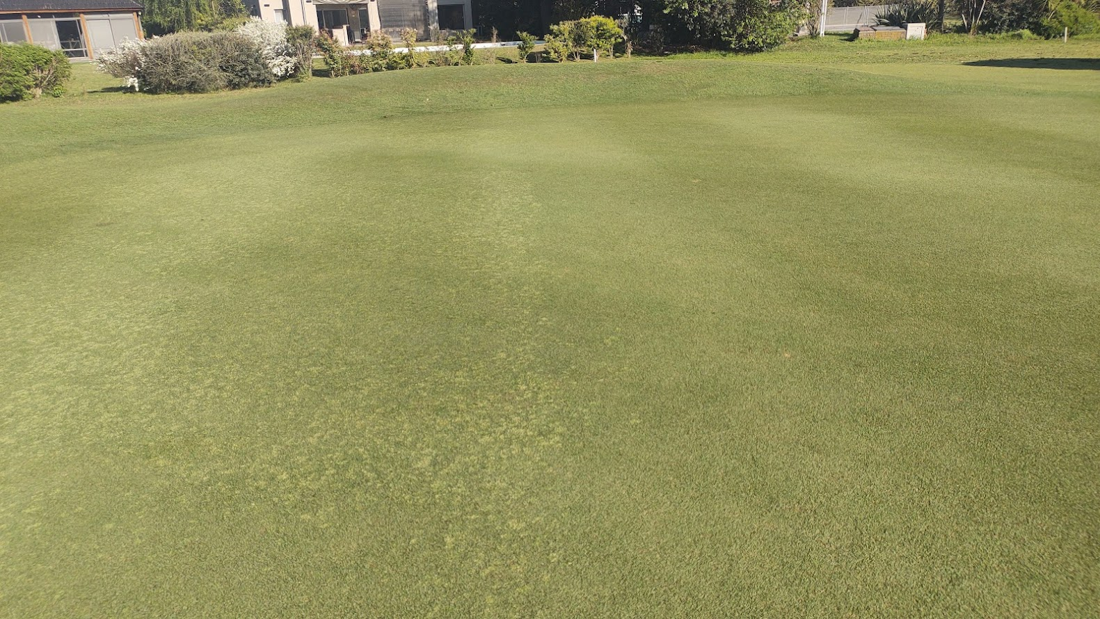 En el caso de la foto vemos un green de Paspalum tratado con Propizamida, un herbicida que controla a la Poa annua en pre emergencia y post emergencia temprana. El herbicida fue aplicado temprano en el otoño, y quedó un sector de green sin aplicar por omisión del operador. Como se puede apreciar, hay una línea recta que divide el sector con Poa y el sector sin Poa. El Paspalum sin Poa será un muy buen green durante toda la primavera, con aspecto homogéneo y sin matas que interfieran con el rodamiento de la pelota. El Paspalum con Poa será todo lo contrario, hasta que esta maleza finalice su ciclo a principios del verano.