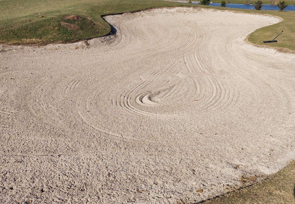 En la foto, un bunker en el cual el operario dio por finalizado el rastrillado, y lo ha dejado «listo para el juego». Vemos el cierre central del rastrillo autopropulsado donde ha quedado un importante surco, sumado a la acumulación de arena (en este caso conchilla). También vemos otros surcos dejados por el rastrillo, y todos los bordes con acumulación irregular de conchilla. En cualquiera de estos sectores donde quede una pelota, hemos ganado una queja del jugador, y probablemente un reclamo hacia el capitán de cancha o a la comisión de turno.