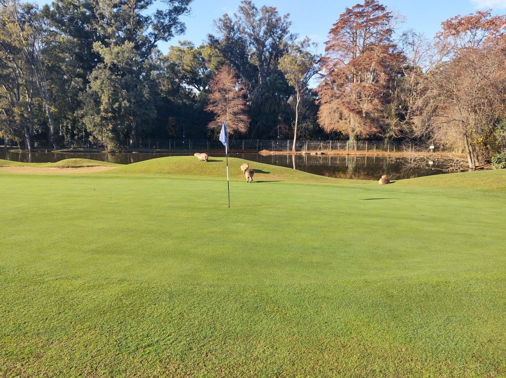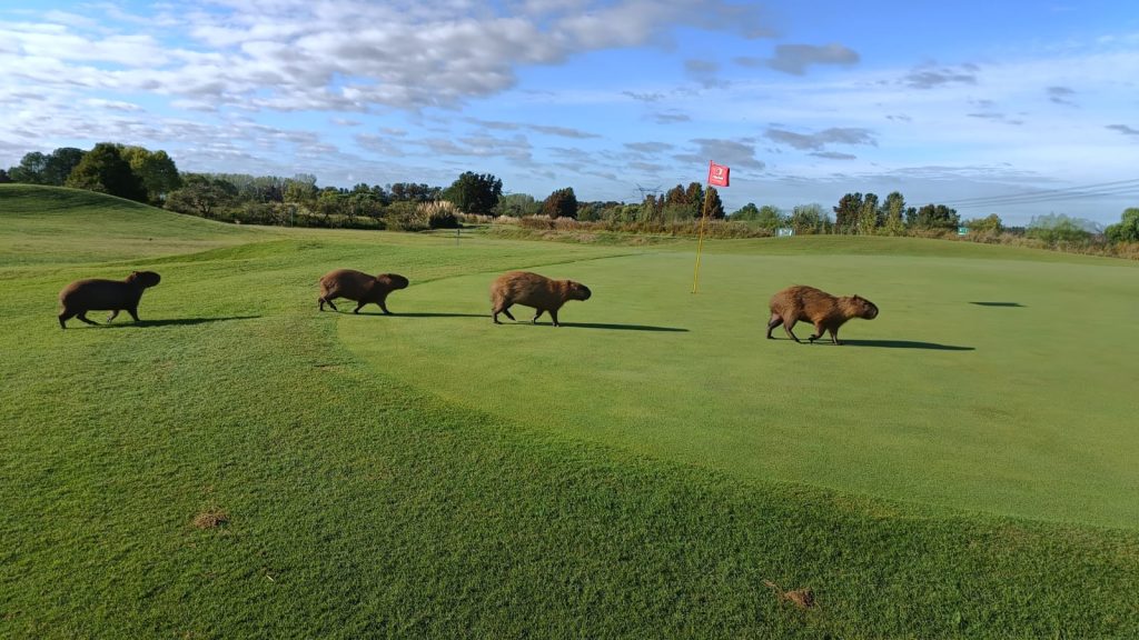 Carpinchos cruzando un green (foto Gustavo Espíndola, El Nacional CC).