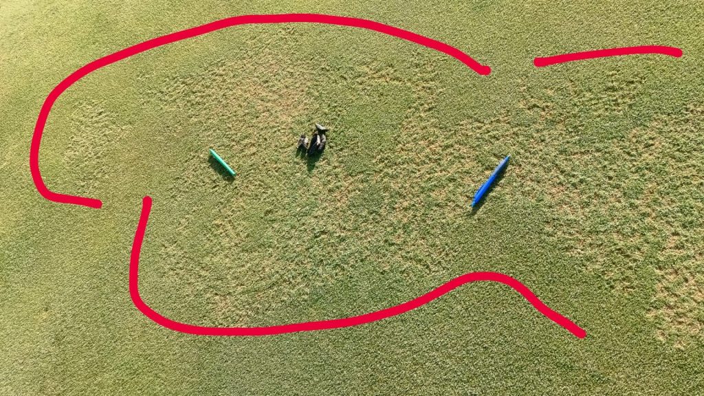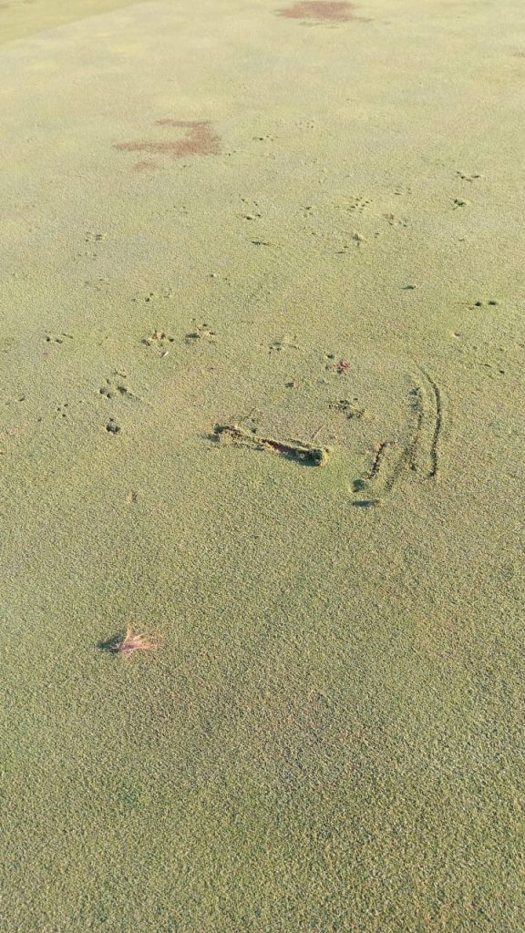 Césped comido y rasgado por carpinchos (foto G. Espíndola).