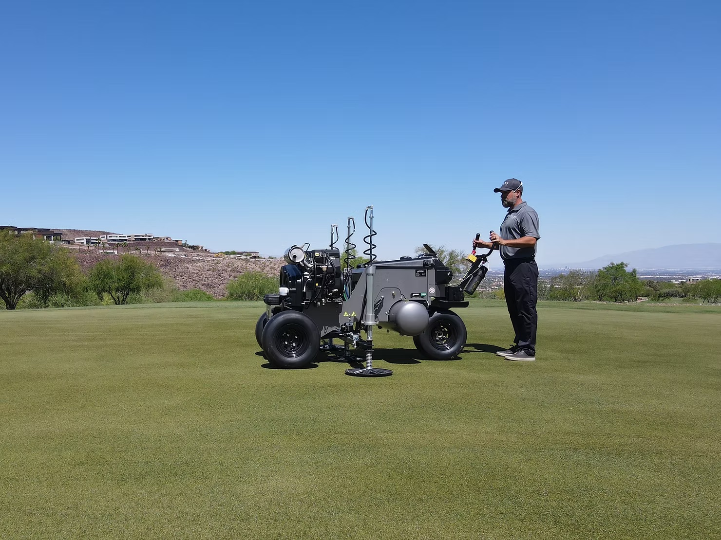 Este equipo es un excelente complemento de la aireación convencional y contribuye de manera eficaz al tratamiento de problemáticas como el black layer, mediante la inyección de aire a presión hasta 30 centímetros por debajo de la superficie, promoviendo el desarrollo radicular y optimizando el drenaje del suelo.