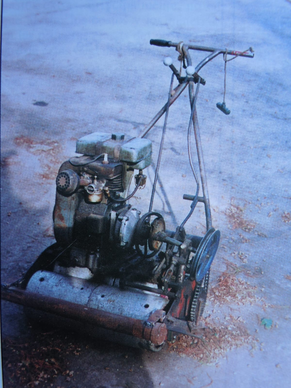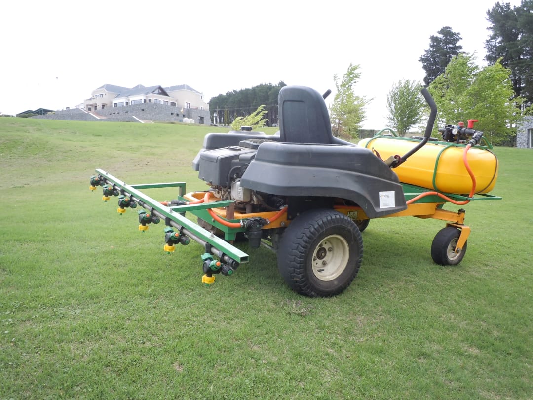 Pulverizadora armada sobre una cortadora de césped a la cual se le quitó la plataforma de corte.