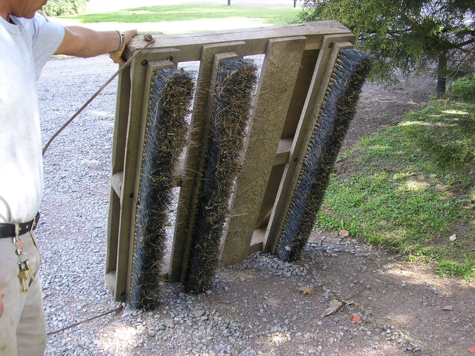 Cepillo de tiro para greens armado sobre un pallet de madera.