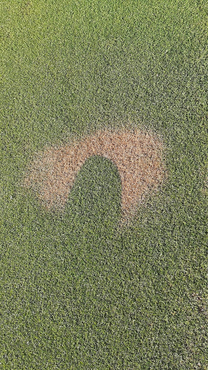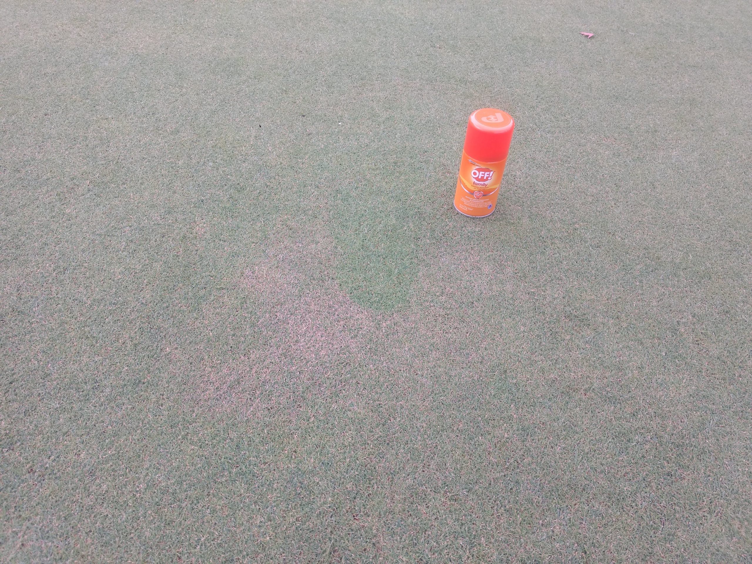 Estamos en época de mosquitos, y el daño se debe al repelente que utilizan los jugadores que juegan en bermudas. Al rociarse las piernas con repelente, rocían también el césped, y los aceites del producto resultan nocivos, pero el producto no llega a tocar el césped en donde se encuentran los zapatos.