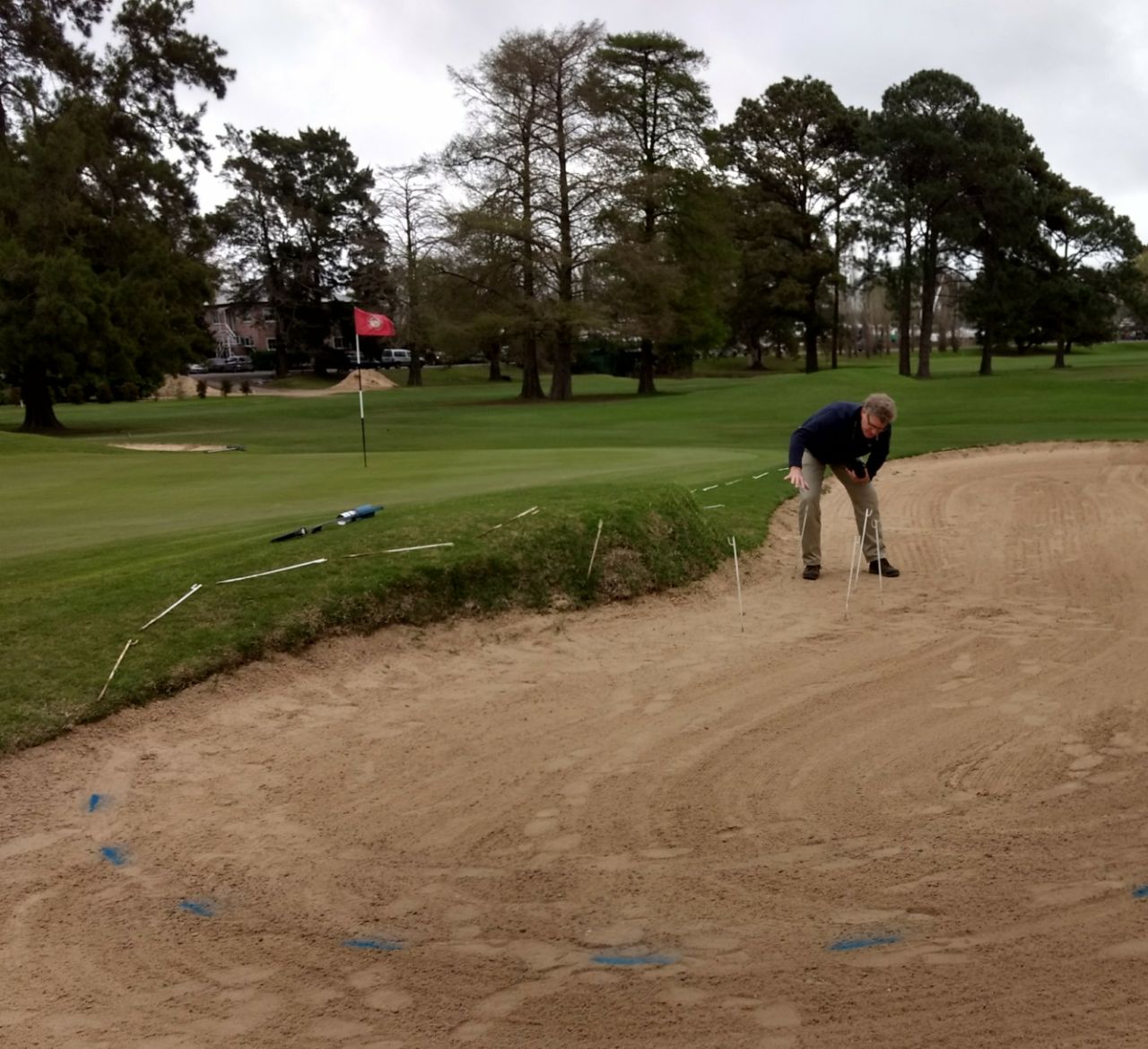 Mike DeVries en acción, explicando la posible modificación de un bunker. En numerosos casos, una reducción en la superficie de arena y un mejor diseño permiten reducir los altos costos de mantenimiento.
