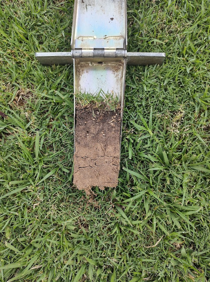 Ahora, ¿qué sucede si suspendemos por un tiempo el programa de topdressing con arena? Dado que el tiempo continúa transcurriendo, y el césped sigue creciendo, veremos una paulatina acumulación de materia orgánica, que se irá acrecentando en la medida en que sigamos sin agregar más arena. Esto es sumamente negativo ya que, si se permite que se forme un estrato orgánico (thatch) por encima de la arena, probablemente habremos perdido buena parte del trabajo realizado durante tantos años. En la foto podemos apreciar un topsoil arenoso sobre el cual se ha formado un estrato orgánico importante (mezclado con algo de arcilla) al suspender por varios años el programa de topdressing. Más thatch implica campos más blandos, más húmedos, más propensos a las enfermedades, menos seguros para jugadores y con menos agarre para los caballos.