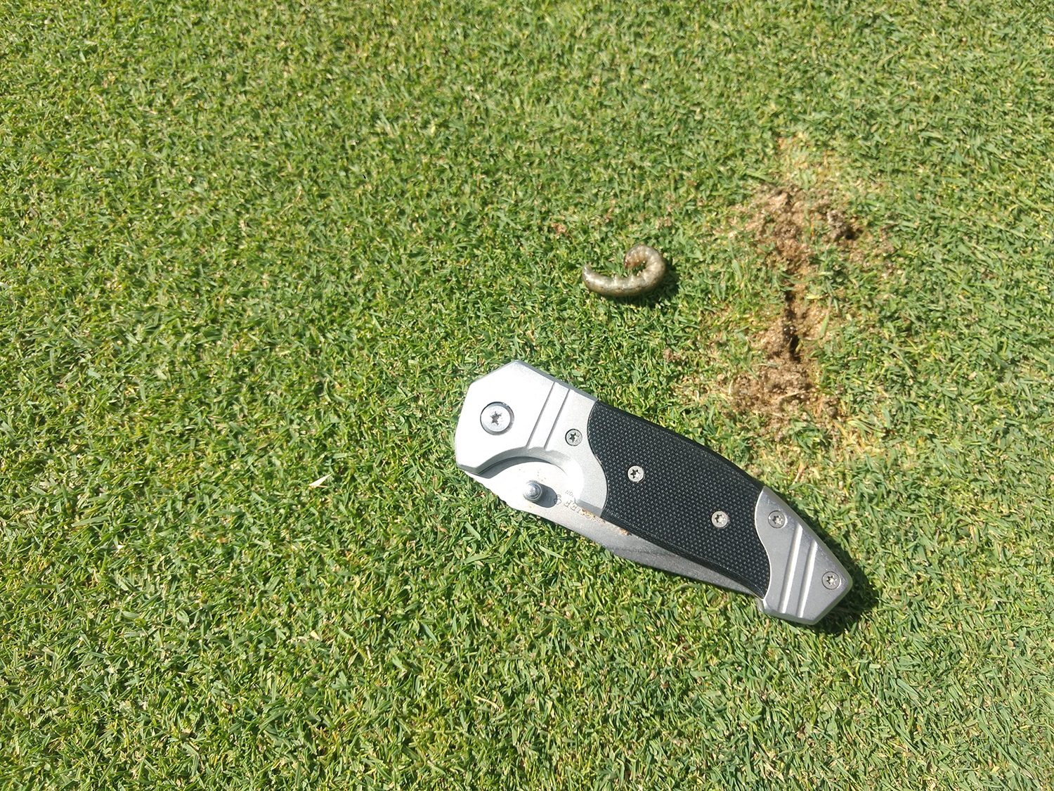 Este verano en el cono sur las orugas estuvieron muy activas. Estas orugas (llamadas también «lagartas» en el Uruguay) comen césped y pueden ocasionar daños importantes si no se controlan a tiempo. En nuestra primera foto, vemos una larva sobre el césped. En nuestra segunda foto podemos ver la habilidad de estos insectos (el adulto es una polilla) para poner huevos donde nadie pueda dañarlos. En este caso, en la base de un lavapelotas de un campo de golf. Se pueden apreciar huevos sin eclosionar y las manchas dejadas por los huevos ya eclosionados y convertidos en pequeñas larvitas.