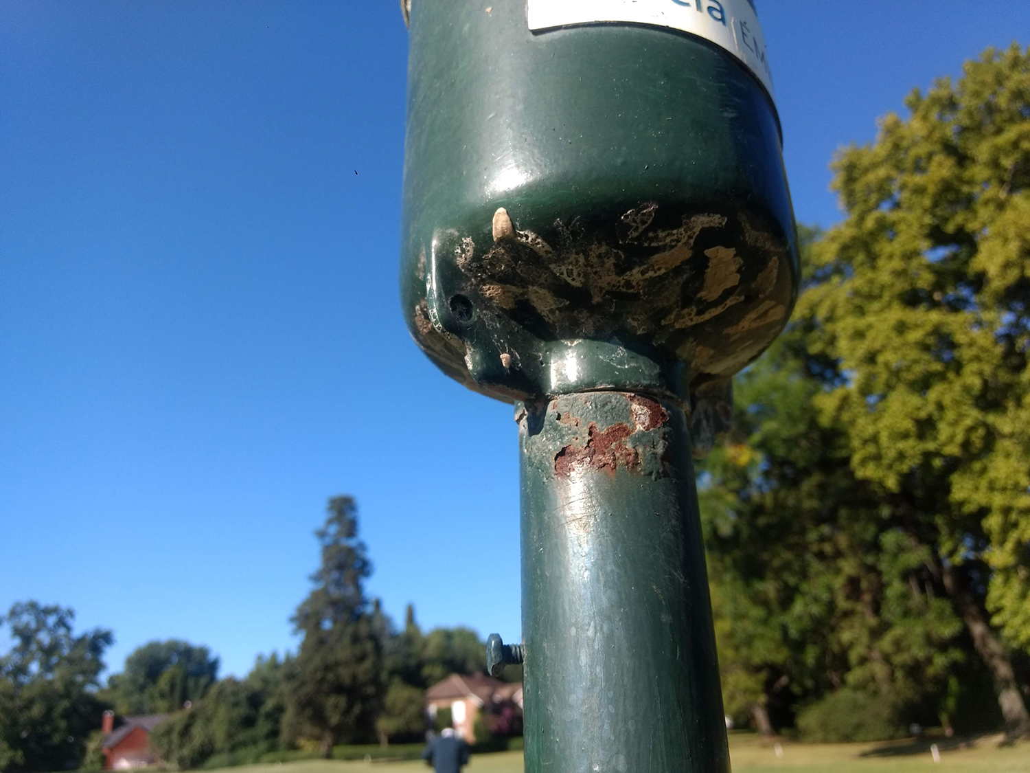 Este verano en el cono sur las orugas estuvieron muy activas. Estas orugas (llamadas también «lagartas» en el Uruguay) comen césped y pueden ocasionar daños importantes si no se controlan a tiempo. En nuestra primera foto, vemos una larva sobre el césped. En nuestra segunda foto podemos ver la habilidad de estos insectos (el adulto es una polilla) para poner huevos donde nadie pueda dañarlos. En este caso, en la base de un lavapelotas de un campo de golf. Se pueden apreciar huevos sin eclosionar y las manchas dejadas por los huevos ya eclosionados y convertidos en pequeñas larvitas.