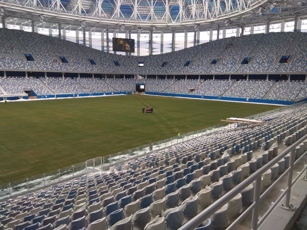 Roman Zhukov encargado del campo del estadio de Nizhny Novgorod acopla sus maquinaria de mantenimiento al Redexim Carrier, ya que la presión resultante sobre el césped es solo la mitad que la de un tractor. Su campo de juego es especialmente débil y sensible inmediatamente después del invierno, el suelo es suave y las marcas de los neumáticos del tractor serán fácilmente visibles, por lo que dejará irregularidades en la superficie. Es por esto que se necesita con urgencia la resiembra para crear una cubierta de hierba completa. Para la resiembra se usó la máquina de siembra rápida Speed-Seed 1200 la que se utilizó tres veces esta primavera, para enterrar las semillas en miles de pequeños agujeros, debajo de la superficie, dando lugar a una rápida germinación. Como la Speed-Seed fue acoplada al Redexim Carrier, la presión sobre el suelo y el impacto sobre el césped fue minima, debido a su bajo peso y neumáticos grandes y lisos que distribuyen uniformemente el peso sobre el suelo.